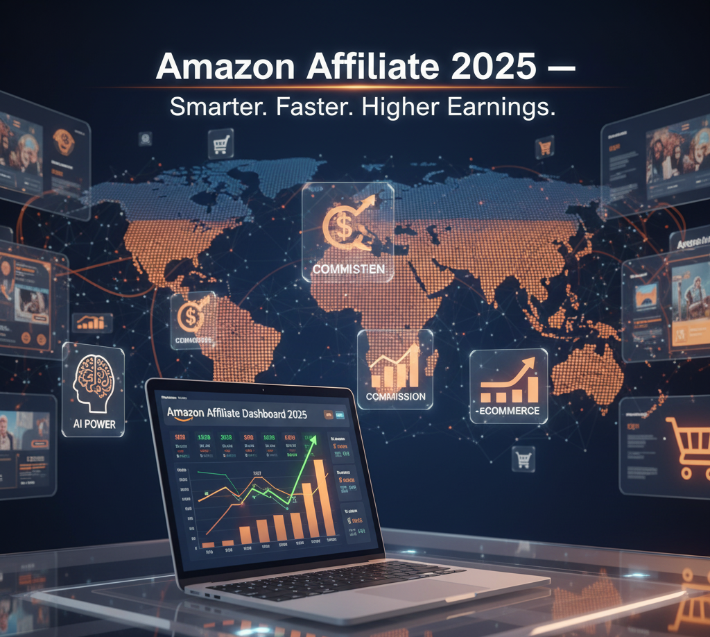 Text overlay: “Amazon Affiliate 2025 — Smarter. Faster. Higher Earnings.”